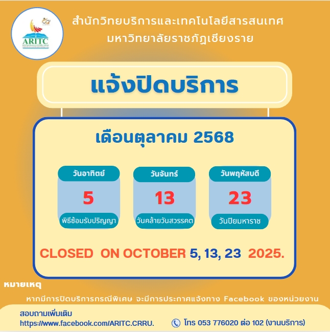 แจ้งวันหยุดให้บริการประจำเดือนตุลาคม 2568